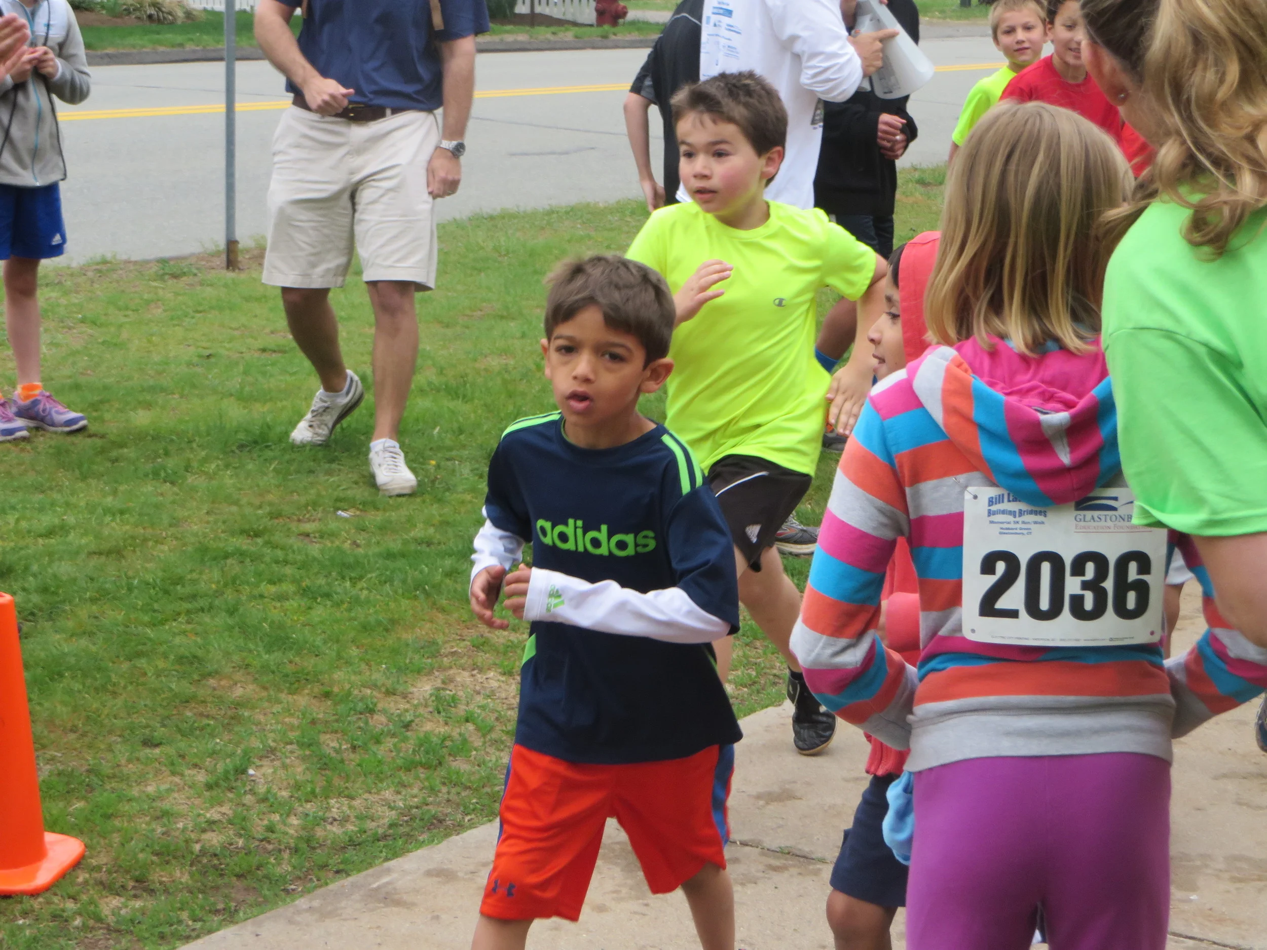 Kyle Morosky, age 6, at the finish of the kids fun run as part of the Bill Landers 5K. Nice finish at 3:19!